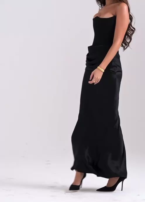 A stunning strapless maxi dress featuring a corset-fitted bodice that beautifully enhances the silhouette. Crafted in a black, the dress exudes elegance and charm. The structured bodice flows seamlessly into a floor-length skirt, creating a graceful and timeless look. Perfect for formal events or glamorous evenings, this dress combines sophistication with a touch of allure, making it a show-stopping choice for any occasion.