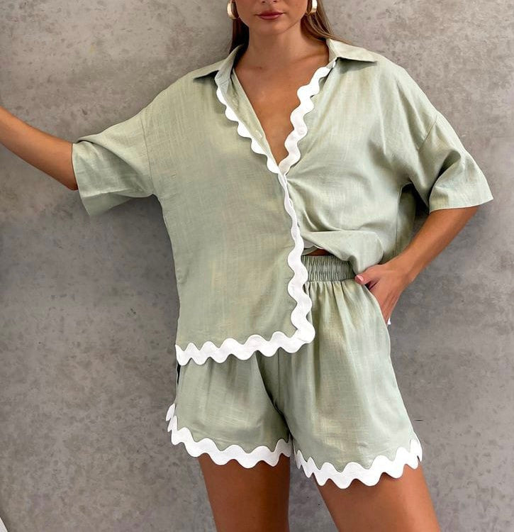 Payment methodsThe co-ord set features a stylish and breezy design, perfect for a relaxed yet chic look. The set includes a pair of light green shorts and a matching loose-fit shirt. Both pieces are adorned with subtle, wavy stripes that add a touch of playful elegance to the ensemble. The shorts have a comfortable, elastic waistband and a flattering mid-thigh length, offering both style and ease of movement. The shirt is designed with a relaxed, oversized fit, featuring a classic collar and button-down front, making it versatile enough to wear tucked in or left out. This light green co-ord set with its wavy stripe pattern exudes a fresh and trendy vibe, ideal for casual outings or lounging in style.