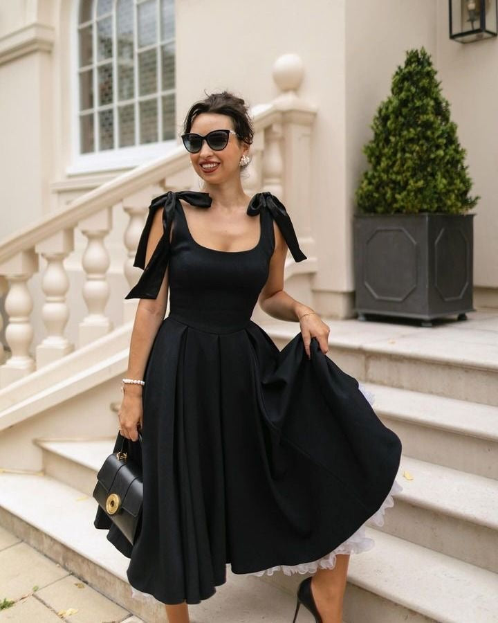 Payment methodsVintage glam meets boardroom boss in this stunning black midi dress. With statement bow-tie shoulders, a fitted bodice, and a twirl-ready flare, this dress is made for the woman who handles deadlines by day and dinner parties by night. The soft yet structured silhouette commands attention while whispering elegance. She’s playful but polished—exactly how a boss lady should be. Whether you’re strutting into a strategy meeting or sipping champagne in the city, this look says: “I own it.”