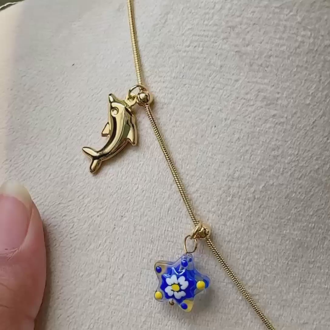 Fun, flirty, and full of personality—this gold-toned charm necklace brings together playful ocean vibes and boho chic. Adorned with a dolphin, blue evil eye, bow charm, and starfish, it’s like wearing a beach day around your neck. A bright blue glass star, a pink bead, and a mini gold moon add dreamy, wanderlust energy. The sleek snake chain gives it a polished finish, while the charms keep it carefree and trendy. Ideal for summer fits, coastal vacays, or just manifesting sunny energy wherever you go.